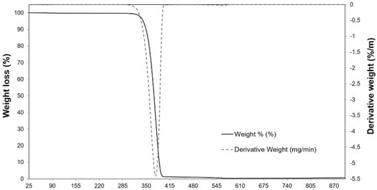 The PLA thermal stability was analysed using a TGA4000 Thermal Analyser (Perkin Elmer, Waltham, MA, USA). The tests were carried out in a nitrogen atmosphere. Samples were heated from 25 °C to 900 °C in a nitrogen flow (20 mL·min−1). They were held at 995 °C for 1 min and then cooled.