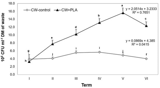 The research revealed that, in addition to the type of experimental variant, the sampling date also significantly affects the level of anaerobic bacteria proliferation (Figure 3). This tendency appeared to be more pronounced in the digestate with PLA, which was confirmed via regression analysis. In the control variant, the abundance of the analysed microorganisms increased until the fourth (IV) time point, after which a decrease was recorded. In contrast, in the object of study with carrier addition, bacterial proliferation successively increased until the fifth (V) time point, after which it declined by 17.6%.
