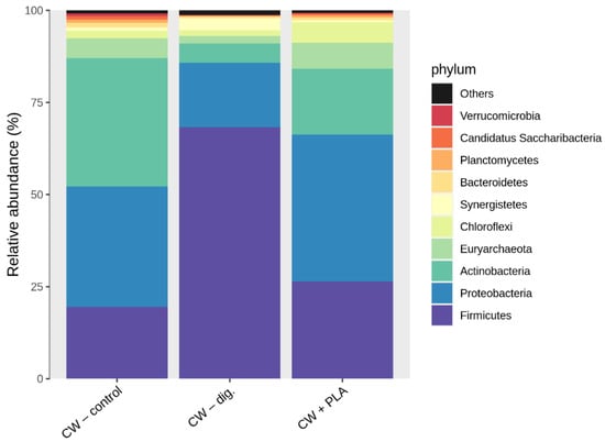 The analysis of the bacterial sequencing data revealed the presence of 170 amplicon sequence variants (ASVs), 100 of which were identified at the genus level, belonging to 86 identified family taxa, 44 identified order taxa, 26 identified class taxa and 17 phylum taxa. The identified microorganisms belonged to bacteria (95% on average) and archaea (5% on average). Clostridiaceae and Syntrophomonadaceae were the most abundant as regards family taxa. Firmicutes were the most abundant phyla, followed by proteobacteria and actinobacteria (see Figure 4). The comparative analysis of the samples made it possible to examine the content of individual taxa over the course of the experiment. Actinobacteria were most abundant in the CW–control sample (34.87%), the percentage of which decreased to 5.3% in the CW–dig. sample and to 17.91% in the CW + PLA sample. At the same time, the dominant taxa in the CW–dig. and CW + PLA samples were firmicutes (CW–dig.: 68.27%, CW + PLA: 26.45%, CW–control: 19.45%). Interestingly, the number of proteobacteria decreased in the CW–dig. sample (17.47%) and increased in the CW + PLA sample (39.82%) compared to CW–control (32.70%).