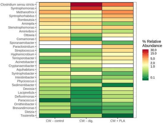 Clostridium sensu stricto was the most abundant genus identified (present in all samples), followed by Syntrophomonas (Figure 5). The number of Clostridium sensu stricto increased in the CW–dig. and CW + PLA samples by 2.5 and 8.5 times, respectively. In the case of Syntrophomonas, its content increased only in the CW–dig. sample (18.68%). The addition of PLA appears to have no effect on the growth of Syntrophomonas. This is different to the changes occurring in systems with DEP and with silica/lignin materials, in which bacteria of the genus Syntrophomonas predominated in the systems of confectionery waste digested with the aforementioned carriers [,]. There are many reports that have investigated the role of Syntrophomonas in anaerobic digestion and the importance of bacteria belonging to the Syntrophomonadaceae family during the methane production from LCFA (long chain fatty acid) and called this a syntrophic partnership with methanogens [,] The methane production from LCFA occurs through a syntrophic partnership between LCFA β-oxidising acetogenic bacteria and methanogenic archaea that are involved in maintaining low concentrations of acetate and hydrogen.