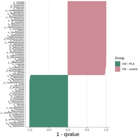 A comparative analysis between CW + PLA and CW–control samples showed differences in the abundance of 89 taxa (higher content of 35 bacteria in the CW + PLA sample).