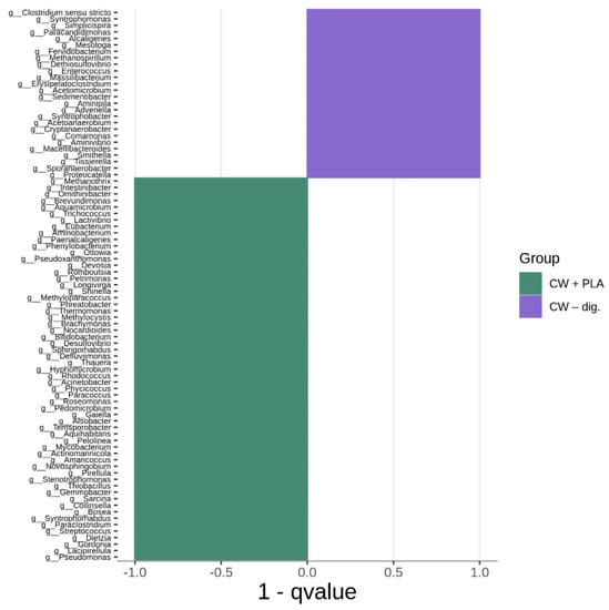 Comparison (MetaStat analysis) of bacterial genus composition between CW + PLA and CW–dig.