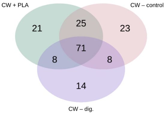 It should be mentioned that many unclassified sequences were also discovered in our study. The highest number of bacteria that were not identified to the genus level was in CW–control (58.061%). Its content decreased to 47.317% in the CW + PLA sample and to 23.856% in the CW–dig. sample. Most of those unclassified bacteria belonged to actinobacteria in CW–control and to proteobacteria in CW + PLA and CW–dig. samples. Compared to CW–control, there was a decrease in the number of 30 unclassified bacteria and an increase in the number of 8 unclassified bacteria after the experiment. There were no changes in the CW–dig. sample compared to CW–control for nine bacteria and in the CW + PLA sample for three unclassified bacteria.