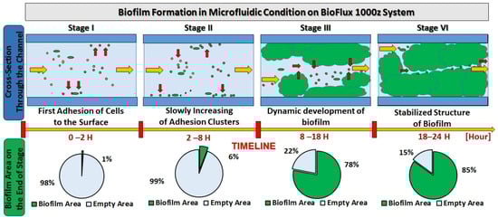 Stages of biofilm formation over 24 h in the channel of a microfluidic system (BioFlux 1000z).