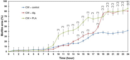 Figure 11 shows the dynamics of biofilm formation for the three samples tested: CW–control, CW–dig. and CW + PLA. It should be noted that in the case of a digested sample but without the addition of the carrier (CW–dig.), there is not such a significant increase in the surface area of the biofilm formed in the channel (between 9 and 18 h). A similar level is only observed after 19 h compared to the sample with the addition of the carrier (CW + PLA). This implies that the carrier significantly promotes the initial adhesion of the microbiome and significantly accelerates its growth, which is positive. At the same time, it should be noted that both samples (CW–dig. and CW + PLA) achieve a significantly larger surface area of the biofilm produced (80%) compared to the control (CW), in which it is approximately 40%.