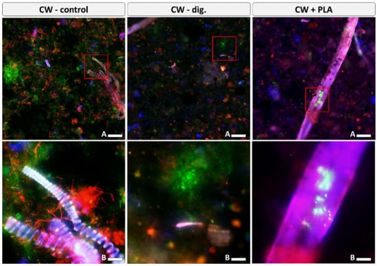 Direct microscopic preparations of bioreactor samples were made. For the CW–control, CW–dig. and CW + PLA samples, they were prepared by adding 100 μL of each sample from the bioreactor to 900 μL of PBS with fluorescent dyes (1 μL Syto 9 [Ex λ = 488 nm] and 1 μL of propidium iodide [Ex λ = 543 nm] [PI]). A filter for DAPI (4′,6-diamidino-2-phenylindole) (filter Ex λ = 359 nm) was used for visualisation of the carriers. The samples were incubated for 30 min under anaerobic conditions and then rapidly visualised by making microscope slides using two typical pieces of glass []. The samples were analysed using a fluorescence microscope (magnification: 10× and 40×) with an Olympus BX51 + DP25 camera (Olympus, Shinjuku, Tokyo, Japan). Scale bar A = 100 μm and B = 20 μm.