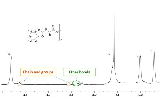 The 1H NMR spectrum (300 MHz, CDCl3, 25 °C) of poly(cyclohexene succinate) Figure S4 of Supplementary Material: 4.75 (bs, CH); 2.51 (bs, 2H, CH2); 1.94–1.68 (bm, 4H, CH2); 1.30 (bm, 4H, CH2). 13C NMR spectrum (CDCl3, 125 MHz) Figure S6 of Supplementary Material: δ 171.8; 73.7; 30.1; 29.4, 28.3.