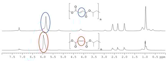 In all cases, alternating structures were obtained, as evidenced by the absence of the resonances characteristic of polyether sequences at 3.5 ppm in the 1H NMR spectra (Figure 2). The composition of the obtained polymer was dictated by its chemical structure; the product was a perfect propylene maleate due to the alternating enchainment of PO and MA. No ether sequences were observed, while the percentage of ester bonds was higher than 99%.