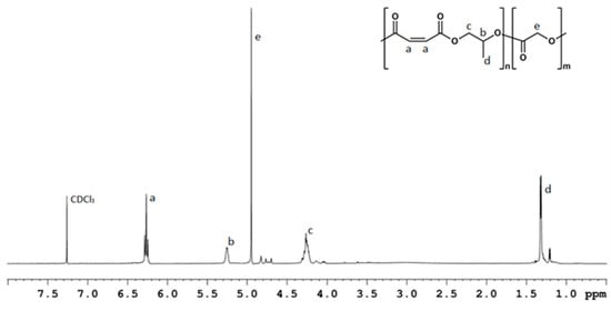 1H NMR spectrum (600 MHz, CDCl3, 298 K) of poly(propylene maleate-block-polyglycolide). The letters a–e refers to the respective hydrogens in the chemical structure.