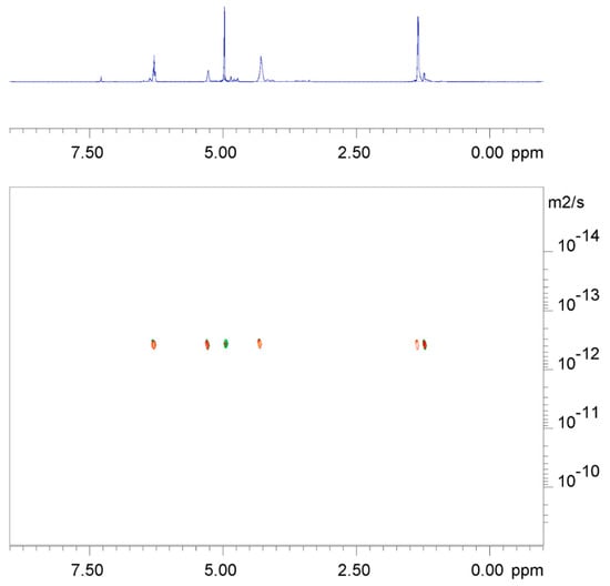 The composition of the copolymer was examined by 1H NMR spectroscopy (Figure 6), which exclusively revealed signals relative to the two blocks of polyesters, without the presence of additional resonances. Similarly, identical lengths of the two blocks were estimated. In the DOSY NMR spectrum (Figure 7), the presence of a single diffusion coefficient for the signals of the polyester fragments was consistent with the formation of a diblock polymer.
