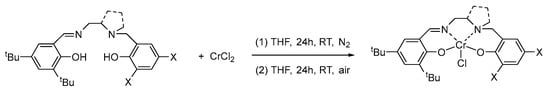 The chromium complexes Cr1–Cr3 were synthesized according to a previously reported procedure through the direct reaction of corresponding ligand precursors with CrCl2 in a THF solution (Scheme 2) [37]. The reaction mixtures were stirred for 24 h at room temperature and exposed to air for an additional 24 h, to allow the oxidation of Cr(II) to Cr(III). The desired complexes were obtained after extraction with water and ethyl ether and were characterized by ESI spectrometry.