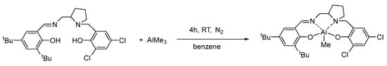 The aluminum complex Al2 was previously reported by our group for the synthesis of polylactide featuring an original gradient isotactic multiblock microstructure, resulting from a combination of enantiomorphic-site and chain-end control mechanisms [39]. It was obtained, in an almost quantitative yield, through a direct reaction between the proligands with one equivalent of AlMe3 ( Scheme 3) and was characterized by 1H and 13C NMR spectroscopy.