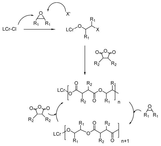 In the last decade, various metal complexes [11,12,13,14,15] and organic molecules [16] have been explored as catalysts in ROCOP for a variety of epoxides and anhydrides. In some cases, regio- and/or stereoselective copolymerization was achieved, producing stereoregular polyesters with enhanced physical properties [17,18].