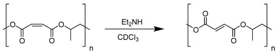 The traditional synthetic method for PPF is the step-growth polycondensation of diethyl fumarate and propylene glycol; however, this approach is generally poorly controlled [19]. An alternative approach is the ring-opening copolymerization (ROCOP) of maleic anhydride (MA) and propylene oxide (PO), which can produce poly(propylene maleate) (PPM), in which the configuration of the double bond is cis; from the PPM, the trans-alkene isomer PPF can be easily obtained using a weak base at low temperatures.