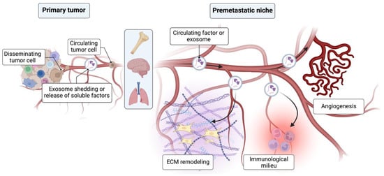 However, the pre-metastatic niche refers to the microenvironment that is created in a distant organ by the primary tumor prior to cancer cell infiltration. It provides a supportive environment by inducing vascular disruption and promoting extravasation, angiogenesis, inflammation and the early remodeling of the extracellular matrix via the recruitment of stromal cells [8].