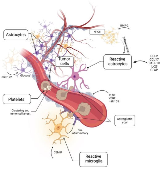An early event in brain metastatic colonization represents the activation of platelets through the von Willebrand factor (VWF) produced by platelets and cerebral endothelial cells. VWF fibers promote platelet clustering and support tumor cell arrest in vessels before extravasation. Interestingly, accumulations of VWF fibers were observed at similar extents in vessels in brain metastatic and perimetastatic regions, as well as in cerebral vessels in tumor-bearing mice without established brain metastasis, indicating a role in premetastatic niche formation [57]. Moreover, glial cells, in particular astrocytes and microglia, are active mediators of cerebral endothelial cell remodeling and are recruited to sites of future metastasis, where they undergo phenotypic switching. In melanoma brain metastasis, astrocyte recruitment involves the upregulation of neuroinflammatory and astrogliotic genes (most notably CCL2, CCl17, CXCL10, IL-23 and GFAP), leading to the formation of a glia scar and BBB disruption—a process well documented in other neuroinflammatory diseases [58,59,60,61,62] (Figure 2). Rodrigues et al. demonstrated that brain tropic breast cancer cells (231-BrT) shed exosomes containing high levels of CEMIP (cell migration-inducing and hyaluronan-binding protein), which increased cytokine production in the microglia with the effect of neuroinflammation and increased the leakiness of the neurovasculature. Although an effect on metastasis formation could be seen in vivo after pre-treatment with exosomes, cellular knockdown of CEMIP also abrogated metastasis. Hence, one could argue that the tumor-growth-suppressing functions of CEMIP significantly confounded the findings [63] (Figure 2). In overt breast cancer metastasis, reactive SIP3 (sphingosine-1 phosphate receptor 3) signaling from astrocytes in the neuroinflammatory response has been shown to regulate the vascular–tumor interface in overt breast cancer metastasis, highlighting a sustained importance of neuroinflammation throughout the metastatic process [64]. Neuroinflammation and glial activation were long regarded as host defense responses leading to tumor cell eradication. However, it is increasingly recognized that the interaction between metastatic tumor cells and microglia in the vascular niche leads to microglial reprogramming and functional cooption. This results in tumor-promoting functions across the stages of metastatic colonization, including vascular remodeling, tumor extravasation and outgrowth [65,66,67,68]. Likewise, functional cooption and the blockading of astrocytes’ anti-cancer functions by metastatic tumor cells at the neurovascular interface have been described and associated with increased brain metastatic potential and the instigation of neuroinflammatory responses [69,70,71]. Accordingly, neuroinflammatory responses have been documented in a number of human brain metastasis samples [72,73].