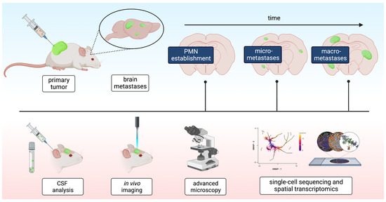 Arguably, the most restricting factor in studying pre-metastatic mechanisms in the brain is defining a suitable time point during the metastasis process and keeping the process as close to the natural biology as possible. As brain metastases are not as abundant in the course of the disease as visceral filliae, the humane endpoint of any experiment might be reached before meaningful conclusions can be drawn. To get ahead of the disease, approaches detecting the earliest micrometastases are needed (Figure 3).