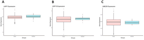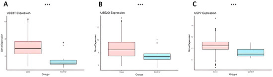 The differential gene expression analysis for UBE2O, UBE2T, USP7, and USP15 was based on microarray data from 1092 patients previously published by our research group [26]. We compared gene expression data from patients with MDS, obtained from primary mononuclear bone marrow (PMBM) cells or CD34+ isolated stem cells, to healthy controls [26]. The analysis of the mononuclear BM cells microarray identified that UBE2T (MDS mean: 7.021 versus Control mean: 5.625; p < 0.001), UBE2O (MDS mean: 8.693 versus Control mean: 7.461; p < 0.001), and USP7 (MDS mean: 12.245 versus Control mean: 11.620; p < 0.001) were all upregulated in PMBM cells of MDS patients compared with healthy controls (Figure 1). However, USP15 did not show any expression during this analysis.