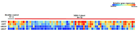 Heatmap of the relative expression levels of the UBE2T, UBE2O, USP7, and USP15 genes in patients with MDS and healthy individuals (control group).