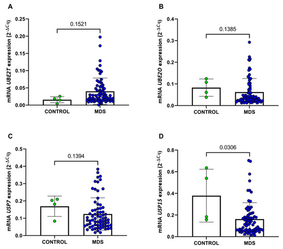 mRNA expression of the genes UBE2T (A), UBE2O (B), USP7 (C), and USP15 (D) in Brazilian MDS patients compared with controls. The p-value data are displayed in the center of the graph, above the connecting arrow between the graphs. Control, n = 4. MDS, n = 72.