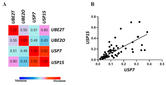 Spearman’s correlation analysis of UBE2T, UBE2O, USP7, and USP15 genes in Brazilian MDS patients. (A) Representation of Spearman’s analyses of controls between the UBE2T, UBE2O, USP7, and USP15 genes against their levels of gene expression in patients with MDS. (B) Spearman’s correlation plot between USP7 and USP15 genes in MDS patients.
