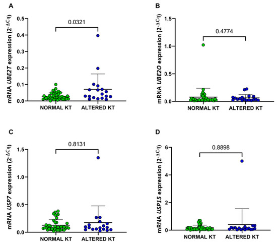 mRNA expression of the genes UBE2T (A), UBE2O (B), USP7 (C), and USP15 (D) according to the presence of chromosomal abnormalities in MDS patients. KT: Karyotype. Normal KT, n = 41. Altered KT, n = 18.