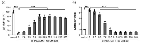 L-buthionine-(S, R)-sulfoximine (BSO) is one of the most widely used potent inhibitors of γ-glutamylcysteine synthetase. BSO causes glutathione (GSH) depletion and cellular ROS accumulation, leading to cell death [14,15,16]. The effects of BSO and DHMBA on the viability and cytotoxicity of HK-2 cells are shown in Figure 1. Cell viability decreased with 100 μM BSO in the absence of DHMBA but improved in the presence of DHMBA in a dose-dependent manner (2–15.6 μM), remaining at similar levels up to 500 μM (Figure 1a). The cytotoxicity increased up to approximately 4.5-fold with 100 μM BSO, compared with the control in the absence of DHMBA, but it decreased in the presence of DHMBA in a dose-dependent manner (2–15.6 μM), remaining at similar levels up to 500 μM (Figure 1b). Overall, DHMBA effectively protected HK-2 cells from BSO-induced cell death and cytotoxicity.