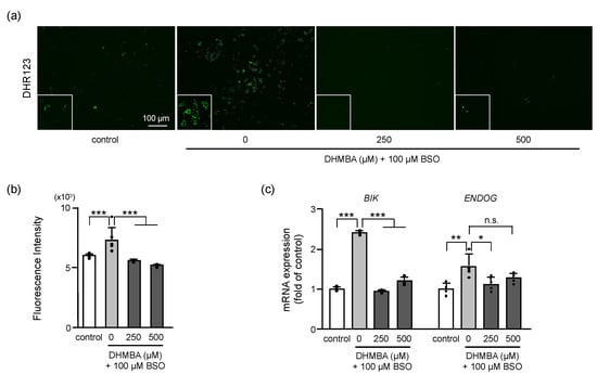 Effects of DHMBA on mitochondrial ROS production and damage in BSO-treated HK-2 cells. (a) Mitochondrial ROS production was measured using the fluorogenic probe DHR123. Images of DHR123 staining following treatment with 0, 250, 500 μM DHMBA with or without 100 μM BSO and (b) its quantitative presentation. Values are presented as means ± SD (n = 6). (c) The mRNA expression levels of BIK and ENDOG based on qRT-PCR. Values are presented as means ± SD (n = 4). * p < 0.05, ** p < 0.01, *** p < 0.001 vs. 100 μM BSO without DHMBA using the Dunnett’s test. n.s.: not significant.