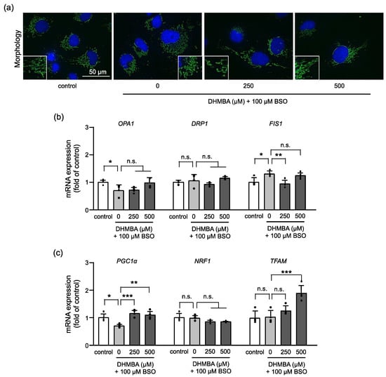 Effects of DHMBA on mitochondrial morphology in BSO-treated HK-2 cells. (a) Images of the mitochondria and nuclei using MitoTracker green and Hoechst33342, respectively. (b) The mRNA expression levels of OPA1, DRP1, and FIS1 based on qRT-PCR. β-actin was used as an internal control. (c) The mRNA expression of the mitochondrial biogenesis-related gene based on qRT-PCR. β-actin was used as an internal control. The data are expressed as the fold induction relative to the control. Values are presented as means ± SD (n = 4). * p < 0.05, ** p < 0.01, *** p < 0.001 vs. 100 μM BSO without DHMBA by the Dunnett’s test. n.s.: not significant.