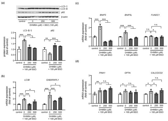 The regulation of autophagy and mitophagy is important for preserving cellular integrity and mitochondrial function. Dysregulation of redox signaling can alter autophagic activity, resulting in cell death [29]. Increasing evidence suggest that oxidative stress acts as the main intracellular signal transducer sustaining autophagy [30,31]. Autophagy degrades damaged organelles by engulfing the damaged one with autophagosomes, which are then fused with lysosomes for degradation. LC3 and p62 are autophagy-related proteins that regulate autophagic activity through a complex signaling network [32,33]. LC3 is processed from its cytosolic form (LC3-I) to its lipidated form (LC3-II) during autophagy, and the ratio of LC3-II/I is a commonly used marker of autophagic activity. p62, on the other hand, is a selective autophagy receptor that binds to ubiquitinated cargo and LC3, facilitating the targeting of cargo to the autophagosome for degradation [32]. Therefore, the protein expression ratio of LC3-II/I increased, and the protein expression of p62 decreased in BSO-treated HK-2 cells, indicating enhanced autophagy in oxidative stress cells. DHMBA reduced the LC3-II/I ratio and increased p62 expression (Figure 4a). Consistent with the protein expression, the expression of autophagosome-related genes, LC3B and GABARAPL1, also increased in BSO-treated HK-2 cells. However, DHMBA decreased the expression of these genes (Figure 4b). p62 binds directly to LC3 and GABARAP family proteins to deliver selective autophagic cargo for degradation. p62 protein is degraded through autophagy and serves as a marker for examining autophagic flux [33]. Thus, DHMBA protected cells from autophagic cell death.