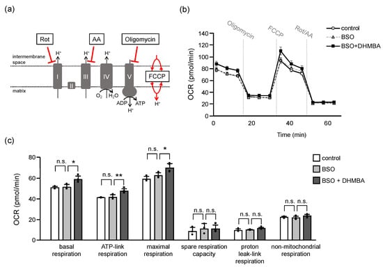 Effects of DHMBA on mitochondrial function in BSO-treated HK-2 cells. (a) Schematic diagram of respiratory complex inhibition. (b) Mitochondrial respiratory profile. OCR was measured over time (pmol/min) using an extracellular flux analyzer. The cells were measured and then injections of the Mito Stress Test Kit were performed for mitochondrial oxidative phosphorylation. (c) The parameters were calculated according to each OCR of mitochondrial oxidative phosphorylation, including basal respiration, ATP-link respiration, maximal respiration, spare respiration capacity, proton leak-link respiration, and non-mitochondrial oxygen respiration. Values are presented as means ± SD (n = 3–4). * p < 0.05, ** p < 0.01 vs. 100 μM BSO without DHMBA using the Dunnett’s test. n.s.: not significant.
