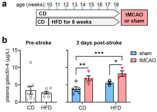 Stroke-associated increases in galectin-4 plasma concentrations are independent of metabolic syndrome. (a) Study design: mice were fed HFD or CD for 8 consecutive weeks. (b) Plasma galectin-4 levels after 8 weeks of HFD or CD feeding (left panel), and 3 days after stroke or sham surgery in mice fed the HFD and CD (right panel). Data are shown as mean ± SEM. Symbols (open grey circles = pre-stroke, open black circles = post-sham surgery, open red triangles = post-tMCAo) represent individual mice. * p < 0.05, ** p < 0.01, *** p < 0.001 based on Fischer’s LSD post-hoc comparison after significant effect of diet and stroke in ANOVA. CD = control diet, HFD = high-fat diet, tMCAo = transient middle cerebral artery occlusion.
