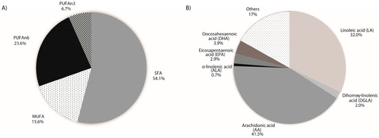 Polyunsaturated fatty acids (PUFAs) are vital macronutrients that are not only required as energy sources, but are also indispensable for their structural and metabolic functions [1], as well as for their involvement in cell signalling processes [2] and inflammation [3]. Alpha-linolenic acid (ALA) and linoleic acid (LA) are essential fatty acids (EFAs) and precursors of the omega 3 and omega 6 series, respectively, that cannot be synthesized by the human body and must be acquired through ingestion [4]. Long chain PUFAs (LC-PUFAs), such as eicosapentaenoic acid (EPA; 20:5n-3), docosahexaenoic acid (DHA; 22:6n-3), and arachidonic acid (AA; 20:4n-6), are synthesized from ALA and LA, though they can also be acquired from the diet. These LC-PUFAs are lipid mediators of critical importance in early development stages [5,6] and throughout the life course [7]. AA and EPA compete for the same conversion enzymes and are involved in similar processes [8] which give rise to derivatives with opposing health effects [9]. The modern dietary transition towards an excessive n-6 consumption with respect to n-3 PUFA has led to a shift in the LA/ALA ratio from 1/1 up to 10–30/1 [10], which has been linked to the pathogenesis of several metabolic diseases such as atherosclerosis, diabetes, and obesity [11].
