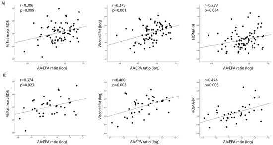 In the n-6 series, AA displayed significant positive associations with offspring visceral fat (r = 0.225, p = 0.04). Moreover, positive associations were identified between the AA/EPA ratio and weight-SDS, BMI-SDS, percent fat mass-SDS, visceral fat, and HOMA-IR (r between 0.202 and 0.383; p < 0.05) (Table 2; Figure 2A). The AA/EPA + DHA ratio also showed positive associations with visceral fat (r = 0.254, p = 0.03).