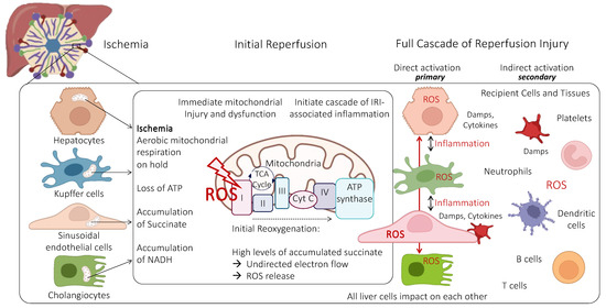Upon the reintroduction of oxygen at reperfusion or transplantation, mitochondria aim to immediately resolve the energy depletion, thus electrons pass though complex proteins in an undirected way, thereby initiating the release of ROS from complex I. Of note, this occurs within the first few minutes after reoxygenation, initiating the unstoppable IRI cascade with the downstream release of mitochondrial DNA, DAMPs, and cytokines. Historically, this phenomenon of ROS release was predominantly allocated to liver macrophages [30]. However, today there is a general understanding that the mitochondrial trigger occurs in all liver cells, which is a particularly critical event during reperfusion in liver SECs [19]. The initial ROS release may also activate Kupffer cells, which express higher levels of selectins and adhesion molecules to attract recipient neutrophils attaching to liver SECs after transplantation.