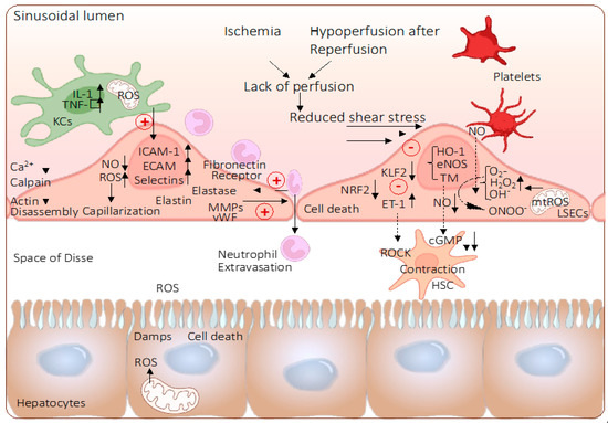 Sinusoidal endothelial cells, with their role as the first liver sinusoidal barrier, are particularly vulnerable to IRI injury and become activated through various trigger molecules either from their own mitochondria or as a response to signals from neighboring cells including hepatocytes, Kupffer cells, or recipient blood cells after transplantation. Liver SECs are localized at the interface between (recipient) blood cells on one side and hepatocytes, Kupffer cells, and stellate cells on the liver tissue side. Severe oxidative SEC injury causes edema, hypoperfusion with secondary hypoxia due to a disruption of the microcirculation, and tissue necrosis [19].