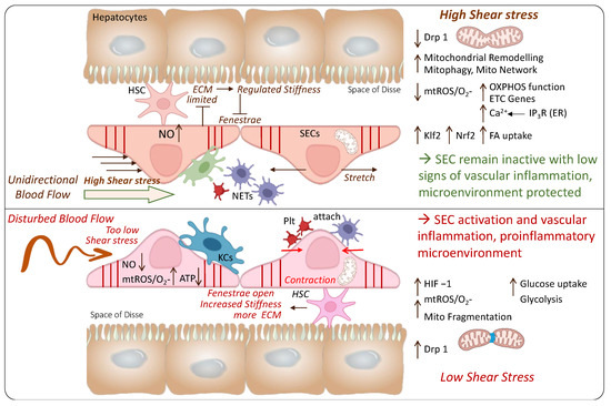 In liver SECs that are positioned in vessel regions with exposure to more DSS, mitochondrial fragmentation is increased. Such mechanisms are initiated by higher expression of dynamin-related protein 1 (Drp1). Further consequences were described above and included mtROS release, a metabolic switch to glycolysis, hypoxia-inducible factor (HIF-1alpha) release, and finally, EC activation [1,9]. Various experimental studies showed that Drp1 inhibition may serve as an interesting strategy to attenuate these proinflammatory mechanisms [1]. The Drp1 enhanced mitochondrial fragmentation in experimental studies using models of carotid artery ligation and microfluid circuits [1,9]. Such findings were further paralleled by increased OXPHOS and fatty acid uptake pointing to a well-functioning mitochondrial complex I through exercise or unidirectional flow (high shear stress) (Figure 3).