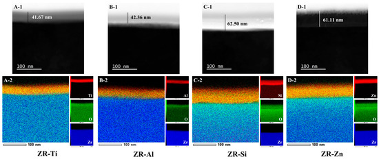 Scanning transmission electron microscope (STEM) cross-sectional images and energy dispersive spectrometry (EDS) elemental color mapping images of ZR-Ti ((A-1,A-2), respectively), ZR-Al ((B-1,B-2), respectively), ZR-Si ((C-1,C-2), respectively), and ZR-Zn ((D-1,D-2), respectively).