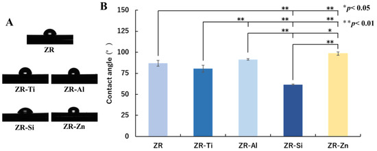 Contact angles between the ultra-pure water droplet and each specimen. (A) Side-view images of a 0.5 μL ultra-pure water droplet placed on each sample. (B) Contact angles of the ultra-pure water droplet on ZR, ZR-Ti, ZR-Al, ZR-Si, and ZR-Zn, measured using an automatic contact angle meter. The data are reported as mean ± SD values (n = 3).