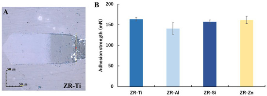 The scratch test results are shown in Figure 3. Figure 3A shows a representative sample surface (ZR-Ti) after an adhesion test. The yellow line indicates the area where a change in the sensor output signal was detected, and the small red circle indicates the adhesion strength measurement point. The average adhesion strengths of ZR-Ti, ZR-Al, ZR-Si, and ZR-Zn were 163.5, 140.9, 157.3, and 161.6 mN, respectively, with no statistical significance among the samples (Figure 3B).