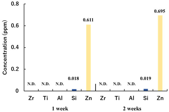 Figure 4 shows the immersion test results for ZR, ZR-Ti, ZR-Al, ZR-Si, and ZR- Zn. For all the samples, the Zr content was below the detection limit. Additionally, the Ti and Al elution amounts in ZR-Ti and ZR-Al were below the detection limits. This indicates that the thin films of TiO2 and Al2O3 on zirconia were chemically stable. By contrast, Si was detected in ZR-Si, with concentrations of 0.018 and 0.019 ppm in the first and second weeks, respectively. Furthermore, Zn was prominently detected in the ZR-Zn sample, with concentrations of 0.611 and 0.695 ppm in the first and second weeks, respectively.