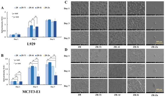 (A,B) L929 and MC3T3-E1 cell proliferation, respectively, on ZR, ZR-Ti, ZR-Al, ZR-Si, and ZR-Zn. The data are reported as mean ± SD values (n = 3). (C,D) Scanning electron microscope (SEM) images of L929 (days 1, 3, and 5 of culturing) and MC3T3-E1 (days 1, 4, and 7 of culturing) cells, respectively, for ZR, ZR-Ti, ZR-Al, ZR-Si, and ZR- Zn.