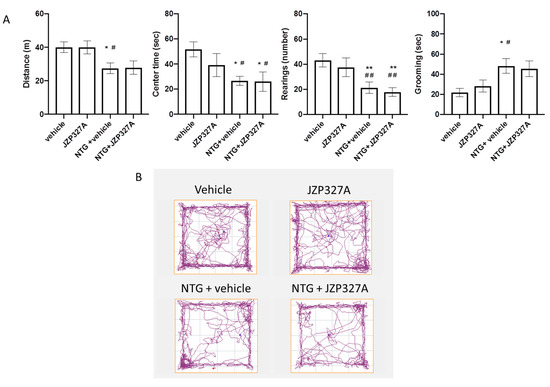 Open field test analysis. (A) Distance (expressed in meters) travelled in the apparatus; time spent (expressed in seconds) in the centre of the apparatus; number of rearing; time spent performing grooming behaviour (expressed in seconds). (B) Representative track plots of the different experimental groups. Male Sprague–Dawley rats were treated with JZP327A at a dose of 0.5 mg/kg, dissolved in a volume of 1 mL/kg of vehicle (tween-80/polyethylene glycol 200/saline) 3 h after NTG or vehicle injection. The locomotor activity, anxiety, and different types of behaviours were evaluated 4 h after NTG or vehicle injection. Data are expressed as mean ± SEM. One-way ANOVA followed by Tukey’s multiple comparisons test; * p < 0.05 and ** p < 0.01 vs. vehicle; # p < 0.05 and ## p < 0.01 vs. JZP327A. Vehicle: control group (n = 9); NTG + vehicle group: nitroglycerin + vehicle (n = 9); NTG + JZP327A group: nitroglycerin + JZP327A (n = 7); JZP327A group: nitroglycerin vehicle + JZP327A (n = 6).