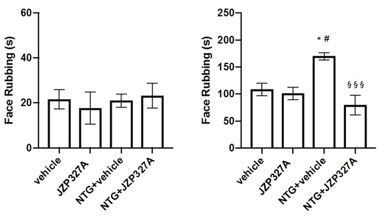 Orofacial formalin test. No significant differences between groups were seen during Phase I of the test. In Phase II, NTG administration (NTG + vehicle) significantly increased face rubbing behaviour compared to the vehicle group. JZP327A injected 3 h after NTG (NTG + JZP327A) significantly decreased face rubbing behaviour in Phase II compared to NTG + vehicle group. No changes were observed when JZP327A was administered alone (without NTG). Data are expressed as mean ± SEM. One-way ANOVA followed by Tukey’s multiple comparisons test: * p < 0.05 vs. vehicle; # p < 0.05 vs. JZP327A; §§§ p < 0.001 vs. NTG + vehicle. Vehicle: control group (n = 9); NTG + vehicle group: nitroglycerin + vehicle (n = 9); NTG + JZP327A group: nitroglycerin + JZP327A (n = 7); JZP327A group: nitroglycerin vehicle + JZP327A (n = 6).