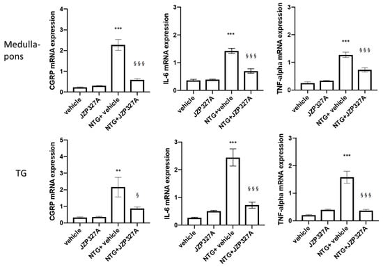 mRNA expression levels of CGRP, IL-6 and TNF-alpha in the medulla-pons and trigeminal ganglion (TG). NTG treatment (NTG + vehicle group) significantly increased mRNA levels of all the genes evaluated compared to vehicle group in all areas. NTG-induced changes were prevented by the administration of JZP327A (NTG + JZP327A). No changes were found in the baseline conditions. Data are expressed as mean ± SEM. Tukey’s multiple comparisons test; ** p < 0.01 and *** p < 0.001 vs. vehicle; § p < 0.05 and §§§ p < 0.001 vs. NTG + vehicle. Vehicle: control group (n = 6); NTG + vehicle group: nitroglycerin + vehicle (n = 6); NTG + JZP327A group: nitroglycerin + JZP327A (n = 6); JZP327A group: nitroglycerin vehicle + JZP327A (n = 6).
