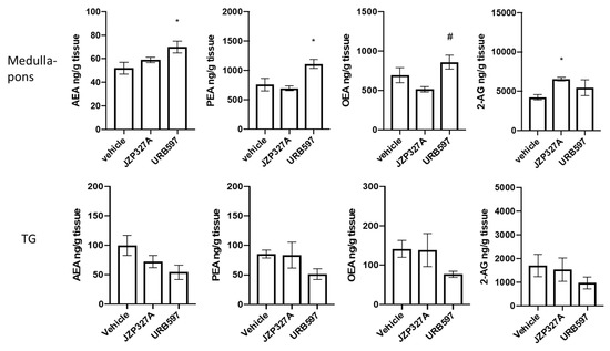 Lipid levels (expressed as ng/g tissue) in the medulla-pons and trigeminal ganglion (TG) of rats treated with vehicle, JZP327A (0.5 mg/kg, i.p.) or URB597 (2 mg/kg, i.p.). Data are expressed as mean ± SEM. Tukey’s multiple comparisons test; * p < 0.05 vs. vehicle; # p < 0.05 vs. JZP327A. Vehicle: control group (n = 6); JZP327A group (n = 6); URB597 group (n = 6).