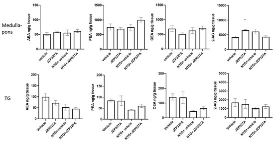 Lipid levels (expressed as ng/g tissue) in the medulla-pons and trigeminal ganglion (TG) of rats treated with NTG vehicle (vehicle), JZP327A, NTG + vehicle, and NTG + JZP327A (n = 6 per group). Data are expressed as mean ± SEM. Tukey’s multiple comparisons test; * p < 0.05 vs. vehicle.