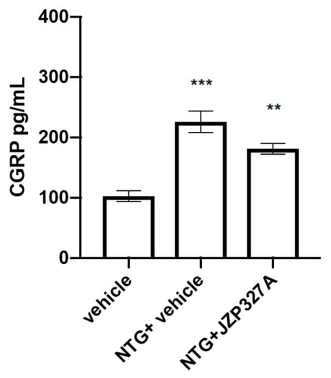 CGRP serum levels (pg/mL). Male Sprague–Dawley rats were treated with JZP327A at a dose of 0.5 mg/kg (i.p.) dissolved in a volume of 1 mL/kg of vehicle (tween-80/polyethylene glycol 200/saline) associated with NTG (10 mg/kg, i.p). Data are expressed as mean ± SEM. One-way ANOVA followed by Tukey’s multiple comparisons test; ** p < 0.01 and *** p < 0.001 vs. vehicle. Vehicle: control group (n = 6); NTG + vehicle group: nitroglycerin + vehicle (n = 6); NTG + JZP327A group: nitroglycerin + JZP327A (n = 6).