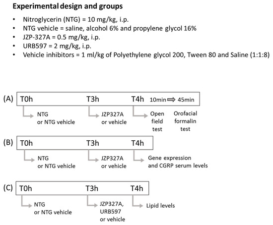 Experimental timeline for the treatment and testing procedures in the three experimental settings used in this study. (A) JZP327A (or vehicle) was administered 3 h after NTG (or its vehicle), meaning 1 h before the open field test; immediately after the open field, rats were injected with formalin (50 μL, s.c.) and the orofacial formalin test was performed (45 min duration). (B) Rats were immediately sacrificed after the drug treatment schedule for the detection of gene expression in cranial tissues and the assay of CGRP serum levels. (C) JZP327A or URB597 (or vehicle) was administered 3 h after NTG (or its vehicle); rats were immediately sacrificed after the drug treatment schedule for lipid assays.