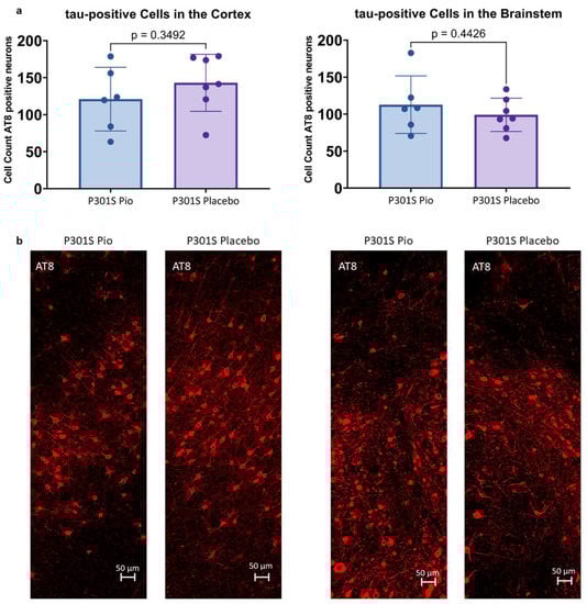 2.2. Pioglitazone Treatment Has No Significant Effect on the Abundance of Tau-Positive Cells in P301S Mice